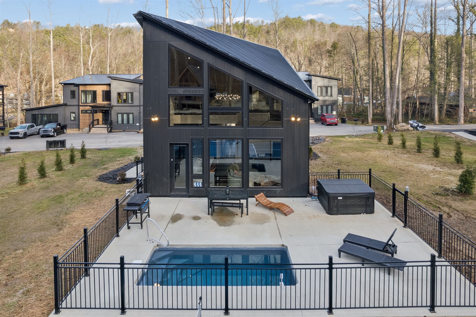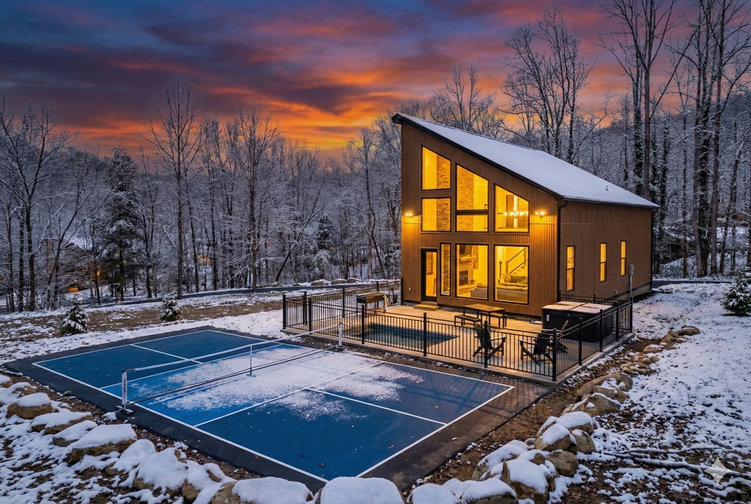 The Ember Den features a private pickleball court and a heated pool, perfect for families and groups.