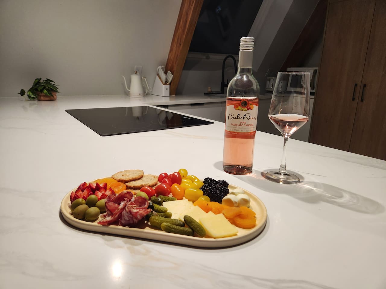 Well socked kitchen with modern appliances spices, baking essentials.