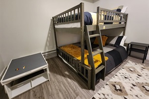 This bedroom has 2 bunk Beds Queen over full.